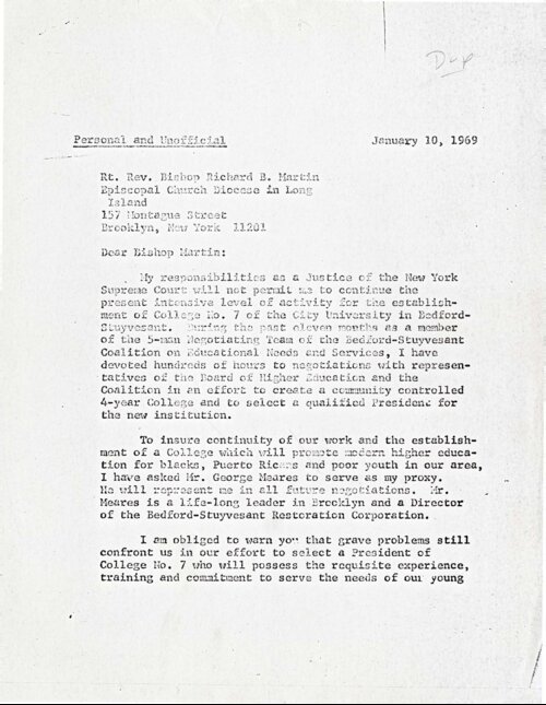 January 10, 1969. Letter from Thomas Jones to Reverend Bishop Richard B. Martin Appointing a Proxy to the Negotiation Team for Community College 7 On January 10, 1969, Justice Thomas Jones wrote to Bishop R.B. Martin, of the Long Island Episcopal Diocese, stating that he would no longer be able to participate in the activities of the five-member Negotiation Team appointed by the Bedford-Stuyvesant Coalition on Educational Needs and Services (B-SCENS) to represent their community in planning Community College 7 with City University of New York (CUNY) officials. Explaining that his “responsibilities as justice of the Supreme Court of New York will not permit me to continue the present intensive level of activity” in plans and negotiations, Jones proposed to appoint George Meares, Director of the Bedford-Stuyvesant Restoration Corporation, as his proxy on the Negotiation Team. Jones also expressed concerns that CUNY officials involved in the planning process “do not yet comprehend what community control and participation must be to overcome the ravages of educational deprivation suffered by the youth of Bedford-Stuyvesant." In the coming weeks, Jones would publicly split from prominent leaders of the Negotiation Team and their allies over key planning decisions for the new college. -