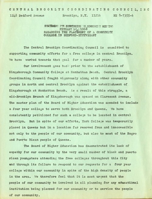 February 14, 1968 Statement of the Central Brooklyn Coordinating Committee Regarding the Placement of a Community College in Central Brooklyn On February 14, 1968, the Central Brooklyn Coordinating Council (CBCC), a community-based organization in Bedford-Stuyvesant, issued a public statement in response to City University of New York (CUNY) officials’ announcement two weeks earlier of plans to establish Community College 7 in Central Brooklyn. In the statement, the CBCC outlined a recent history of their efforts to advocate for a tuition-free college in Bedford-Stuyvesant, as well as criticized CUNY’s “lack of empathy for [their] community," demonstrated in a continuing pattern by CUNY of establishing new colleges in neighborhoods inaccessible to Black and Puerto Rican youth. The CBCC expressed support for Community College 7, concluding with demands that the community be involved directly in the planning for the new college. -