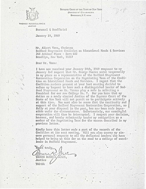 January 19, 1969, Letter from Justice Thomas Jones to Al Vann announcing Jones's resignation from the Negotiation Team for Community College 7 On January 19, 1969 New York State Justice Thomas Jones wrote to Al Vann, Chairman of the Bedford-Stuyvesant Coalition for Educational Needs and Services (B-SCENS), resigning from his position as a member of the five-member Negotiation Team appointed to represent the Bedford-Stuyvesant community in plans and negotiations with City University of New York (CUNY) officials for Community College 7. Jones’s resignation letter marked the culmination of his correspondence with Vann over the past month, in which he had initially proposed to appoint a proxy to the Negotiation Team, a suggestion Vann rejected on procedural grounds. Although Jones apparently resigned from the Negotiation Team in this letter, he remained directly involved in public discussions about Community College 7, and was a key actor in a conflict that developed in the coming weeks between Bedford-Stuyvesant community leaders over plans for the new college. -