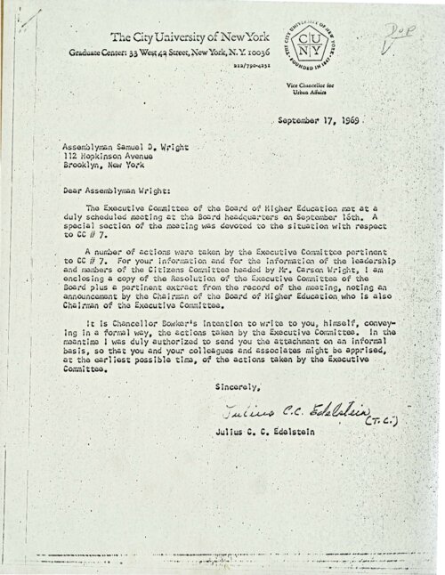 September 17, 1969 Letter from CUNY Vice Chancellor Julius C. C. Edelstein to Assemblyman Samuel Wright On September 17, 1969, Julius Edelstein, Vice Chancellor of the City University of New York (CUNY), wrote to Assemblyman Samuel Wright, who represented Central Brooklyn, to inform him of the Executive Committee of the Board of Higher Education (BHE)’s resolution the day before in relation to Community College 7. In that resolution, the Executive Committee had formally dissolved the Presidential Search and Planning Committee for Community College 7, composed of five CUNY officials and five representatives of Bedford-Stuyvesant’s education and community organizations. The BHE Executive Committee had further resolved to expedite plans for the new college for Central Brooklyn under the leadership of officials CUNY leaders would appoint. -