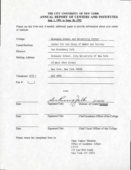 Annual Report of Research Centers and Institutes July 1, 1991 - June 30, 1992 This annual report of the Center for the Study of Women and Society (CSWS) from July 1, 1991, to June 30, 1992, provided a summary of CSWS's mission, activities, scholarly papers in refereed journals, abstracts, and other publications, financial support, facilities, equipment, budget, and personnel. CSWS's mission was identified as the development, encouragement, and sponsoring of research in women's studies; provision of assistance to both graduate and undergraduate programs at the City University of New York (CUNY) for major and minor courses; development of programs in women's studies in community education; and the encouragement and coordination of doctoral courses related to women and society. However, due to the growth of different initiatives and accomplishments, CSWS no longer assumed responsibility for coordinating women's studies courses or functioning as a primary source for student advisement, as these were now the responsibility of the Women's Studies Certificate Program office that CSWS had helped to establish. In this report, CSWS cemented its commitment to focusing on gender, race, ethnicity, and class internationally, particularly in urban communities. It stated that several books, chapters, papers, articles, abstracts, and newsletters had been published under the auspices of CSWS and were available upon request.Additionally, many CSWS members had been involved in lectures, seminars, conferences, and symposiums. CSWS members also worked with grassroots organizations, such as the New York City Coalition for Women's Mental Health, publications such as "Sex Roles: A Journal of Research" and The Feminist Press, the Feminist Academy, and the Visiting Scholars program. CSWS received grants from the Japan Institute for Women and Minor's Problems, UNIFEM, the Ford Foundation, and the CUNY Graduate School and had proposed more grants to the same agencies and the National Institute of Drug Abuse. In the 1991 – 1992 fiscal year, the budget indicated that CSWS had spent $78,000 on an income of $101,000. -