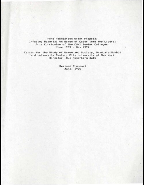 Ford Foundation Grant Proposal: Infusing Material on Women of Color into the Liberal Arts Curriculum of the CUNY Senior Colleges This revised June 1989 grant proposal from the Center for the Study of Women and Society (CSWS) to the Ford Foundation requested support for a project designed to incorporate material by and about women of color (WOC) into introductory courses at the ten senior City University of New York (CUNY) colleges. Project designers wished to encourage and assist full-time liberal arts faculty by offering seven intensive one-week seminars, each one targeting a specific introductory course in American history, American literature, economics, political science, sociology, psychology, and English composition. The project designers aimed to provide information and resources for each discipline and establish a formal and active network to continue to promote this integration long after the grant had terminated. The grant would include monthly meetings with invited speakers and discussion groups and monthly newsletters containing teaching experiences and curriculum suggestions. A "Communication Network," consisting of three colleagues per participant that might be responsive to outreach, would also be established. A primary goal of the project was to have as many CUNY faculty members as possible, both male and female, integrate a least some material on women of color into their curricula, and have them understand that they had enough resources to diversify their curricula even if they were not experts on women's, ethnic, or minority studies. The author of the proposal wrote that, all too often, the structure of women's, ethnic, and minority studies reinforced the idea that these were "special topics" and not integral parts of their specific fields of study. Each of the 100 faculty selected to participate in the project would receive a $350 stipend for their work. -
