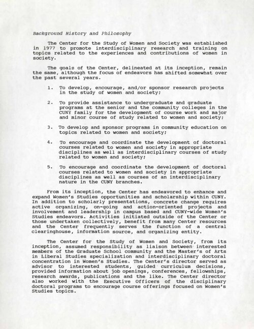 Background History and Philosophy of the Center for the Study of Women and Society (CSWS) from 1979 - 1996 This 1996 document provided a concise background history of the Center for the Study of Women and Society (CSWS) from its inception in 1977. It began with CSWS's organizing goals in 1977, which were to promote interdisciplinary research and training on topics related to the experiences and contributions of women in society. To do so, CSWS worked to provide opportunities for scholarly presentations and active organizing; acted as a liaison between City University of New York (CUNY) Graduate School members and the Master's of Arts in Liberal Studies (MALS) program's Women's Studies concentration; and provided information on job openings, conferences, fellowships, research awards, and publications. In 1983, CSWS founded the CUNY Feminist Network, which facilitated students' search for appropriate mentors. In 1985, CSWS began designing the Certificate Program in Women's Studies at the CUNY Graduate School. This was approved in the Fall of 1988 and was operative in the Spring 1989 semester. In 1987, CSWS formed the Feminist Academy to encourage members to participate in individual support and involvement through special event invitations and discounts on books from the Feminist Press. By 1996, neither the Feminist Network nor the Feminist Academy existed. The document continued with a list of activities and projects from 1984 to 1996; lists of CSWS's directors from 1979 to the time of the document's writing; a list of the Visiting Scholars from 1984 to 1997; a list of the various CSWS sponsored study groups; a list of CSWS's numerous publications; a list of the different sources of funding for CSWS activities from 1983 to 1997; CSWS governance and facilities; a list of CSWS's speakers for its ongoing speaker series from 1979 to 1996; a list of film screenings from 1979 to 1996; and a list of conferences from 1980 to 1996. -