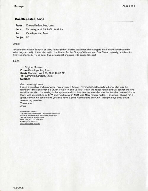 An Email Thread: Who Actually Was the First Director of the Center for the Study of Women and Society (CSWS)? This document provides an email thread that began on March 31, 2008, with Anne Humpherys, part of the Graduate Center's External Review Committee for the Center for the Study of Women and Society (CSWS). In her email, Humpherys stated she was responsible for writing CSWS's history but could not find a list of directors before 1994, when CSWS's director position was combined with the Women's Studies Certificate Program (WSCP) coordinator. Laura Ciavarella-Sanchez, Elizabeth Small, Susan Saegert, Cynthia Epstein, and Anne Kanellopoulos were added to the thread. Finally, though the original director was said to be Mary Brown Parlee, who started in 1979, it was acknowledged that Susan Saegert operationally ran the center from 1977 to 1979. The email thread also revealed that the singular "no" vote on CSWS's creation indicated skepticism and hostility to the fact that such a center was even being considered. -