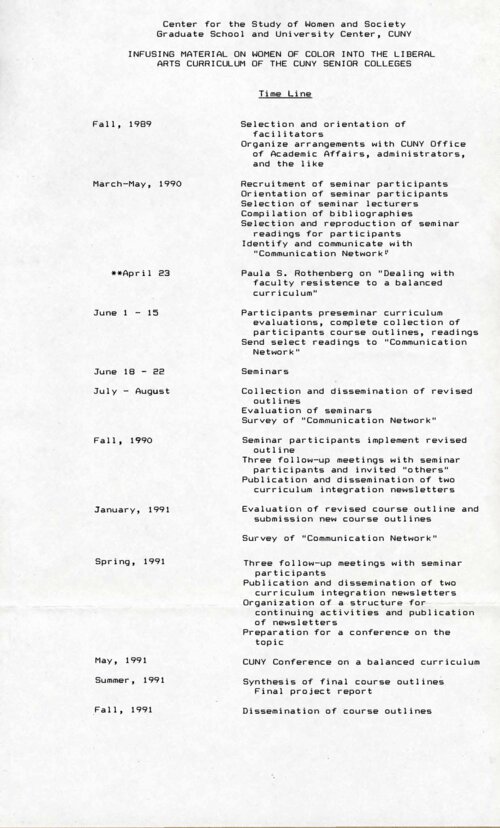 Infusing Material on Women of Color Project Timeline A part of the Ford Foundation grant proposal, this file provided a timeline for implementing the inclusion of material on and by women of color (WOC) into the liberal arts curriculum of the City University of New York (CUNY) senior colleges. The timeline had the project set to begin in the fall of 1989 with the selection and orientation of facilitators, followed by the recruitment and orientation of seminar participants from March to May 1990. That three-month period also included selecting seminar lectures and readings for participants and communication with the "Communication Network." A talk by Paula S. Rothenberg, entitled, "Dealing with Faculty Resistance to a Balanced Curriculum" was scheduled for April 23, 1990. The seminars associated with the project were expected to take place from June 18 to 22, 1990. In July and August, there would be a collection and dissemination of revised outlines for courses, evaluations of the seminars, and a survey for the "Communication Network." By the Fall of 1990, participants were expected to implement revised outlines, attend meetings, and publish two newsletters to integrate WOC material into the curricula. In May 1991, there would be a conference on what was a balanced curriculum. The final product, integrated course outlines, would be disseminated in the fall 1991 semester. -