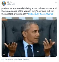 Tweet: School is still open? This tweet from a City University of New York (CUNY) student pointed out the discrepancy between faculty preparation for online teaching and the continued operation of CUNY campuses. As expressed in other tweets (see the series "Tweet: Lehman President Explanation"), many CUNY campuses were preparing for an online transition before the university's initial decision to close due to the Covid-19 pandemic. However, much of this preparation remained largely unofficial and not transparent to the CUNY student body. As demonstrated in this tweet, this apparent lack of communication created a sense of disconnect between CUNY students and administration, often expressed in a lighthearted fashion through memes. This item is part of the City University of New York (CUNY) Distance Learning Archive, a group project developed as part of Prof. Matthew K. Gold's Spring 2020 Knowledge Infrastructures seminar in the Ph.D. Program in English at The Graduate Center, CUNY, in partnership with the Interactive Technology and Pedagogy Certificate Program. The project's goal was to resist or trouble the discourse of catastrophe around the shift to online learning caused by the COVID-19 pandemic by documenting the lived experiences of students, faculty, and staff across CUNY's 25 campuses. Further, the project wanted to document the moment of crisis response by taking a critical approach to educational technology. -