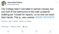 Tweet: City College Bathrooms Under Repair Amid COVID-19 Outbreak As with most public institutions, during the first wave of the Covid-19 pandemic, the City University of New York (CUNY) struggled with acquiring sufficient funding to meet the infrastructural needs of its physical facilities. With this tweet, referencing this NBC article and posted on March 11, 2020, we saw how the difficulty in maintaining functional, hygienic restrooms failed to satisfy the necessary conditions for student wellbeing amid the rise of COVID-19 in NYC. In expressing exasperation at the inaccessible state of City College's bathroom facilities, this tweet captured the locally situated impact of austerity and mismanagement of funding for maintenance and emergency preparedness of CUNY's physical infrastructure amid the public health crisis of the pandemic. This item is part of the City University of New York (CUNY) Distance Learning Archive, a group project developed as part of Prof. Matthew K. Gold's Spring 2020 Knowledge Infrastructures seminar in the Ph.D. Program in English at The Graduate Center, CUNY, in partnership with the Interactive Technology and Pedagogy Certificate Program. The project's goal was to resist or trouble the discourse of catastrophe around the shift to online learning caused by the COVID-19 pandemic by documenting the lived experiences of students, faculty, and staff across CUNY's 25 campuses. Further, the project wanted to document the moment of crisis response by taking a critical approach to educational technology. -