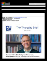 Telecommuting Plans Released on March 15, 2020, this email represented an official communication from City University of New York (CUNY) Chancellor Matos Rodriguez on university guidelines, expectations, and intent to set up telecommunications for CUNY's operations. In this lengthy email, we again see the unique balance of conciliation and professionalism that the CUNY administration had attempted to convey throughout the pandemic. While we are typically used to separating questions of logistics and human effect, the creation of online learning systems during the pandemic revealed such concerns to be hardly disparate. This item is part of the City University of New York (CUNY) Distance Learning Archive, a group project developed as part of Prof. Matthew K. Gold's Spring 2020 Knowledge Infrastructures seminar in the Ph.D. Program in English at The Graduate Center, CUNY, in partnership with the Interactive Technology and Pedagogy Certificate Program. The project's goal was to resist or trouble the discourse of catastrophe around the shift to online learning caused by the COVID-19 pandemic by documenting the lived experiences of students, faculty, and staff across CUNY's 25 campuses. Further, the project wanted to document the moment of crisis response by taking a critical approach to educational technology. -