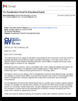Recalibration Period for Educational Equity As many artifacts in this collection have suggested, the switch to online learning was abrupt for faculty, administration, and students alike. A week to transfer an entire university system to a digital format, especially when many community members did not have reliable internet access, was not enough time. As such, the City University of New York (CUNY) required a second adjustment period, or 'recalibration,' postponing classes yet again for faculty and students to acquire necessary resources for online instruction. Sent on March 23, 2020, this email from Chancellor Rodriguez summarized the rationale behind such a decision. This item is part of the City University of New York (CUNY) Distance Learning Archive, a group project developed as part of Matthew K. Golds Spring 2020 Knowledge Infrastructures seminar in the Ph.D. Program in English at The Graduate Center, CUNY, in partnership with The Interactive Technology and Pedagogy Certificate Program. The project's goal was to resist or trouble the discourse of catastrophe around the shift to online learning caused by the COVID-19 pandemic by documenting the lived experiences of students, faculty, and staff across CUNY's 25 campuses. Further, we wanted to document the moment of crisis response with a critical approach to educational technology. -