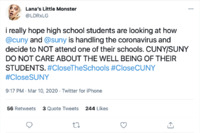Tweet: CUNY/SUNY Pandemic Response & Student Wellbeing Posted on March 11, 2020, this tweet echoed related Twitter artifacts from this collection in scrutinizing the perceived lack of preparedness and administrative indifference of the City University of New York (CUNY) toward the health and safety of its student population. In its desire for "high school students" to be "looking" at how CUNY was dealing with COVID-19, the tweet also gestured toward a sense of posterity for the institutional landscape of public higher education. These locally situated perspectives on the university's response to the pandemic, in turn, reflected a longstanding, historically charged relationship between CUNY as an institution and the broader community of NYC citizens. This item is part of the City University of New York (CUNY) Distance Learning Archive, a group project developed as part of Prof. Matthew K. Gold's Spring 2020 Knowledge Infrastructures seminar in the Ph.D. Program in English at The Graduate Center, CUNY, in partnership with the Interactive Technology and Pedagogy Certificate Program. The project's goal was to resist or trouble the discourse of catastrophe around the shift to online learning caused by the COVID-19 pandemic by documenting the lived experiences of students, faculty, and staff across CUNY's 25 campuses. Further, the project wanted to document the moment of crisis response by taking a critical approach to educational technology. -