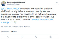 Tweet: Lehman President Explanation This series of tweets from the president of Lehman College, Daniel Lemons, provided an official response to demands for CUNY's closure, explaining that the logistics facing CUNY's transition to distance learning were markedly different from other institutions of higher education given its status as a public institution. Amidst many claims of institutional indifference, this artifact provided an official rationale for the perceived latency in CUNY's response to the pandemic, raising issues of equity and public duty within debates about health and economics. This item is part of the City University of New York (CUNY) Distance Learning Archive, a group project developed as part of Prof. Matthew K. Gold's Spring 2020 Knowledge Infrastructures seminar in the Ph.D. Program in English at The Graduate Center, CUNY, in partnership with the Interactive Technology and Pedagogy Certificate Program. The project's goal was to resist or trouble the discourse of catastrophe around the shift to online learning caused by the COVID-19 pandemic by documenting the lived experiences of students, faculty, and staff across CUNY's 25 campuses. Further, the project wanted to document the moment of crisis response by taking a critical approach to educational technology. -