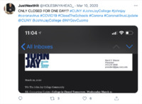 Tweet: Reaction to Coronavirus Update at John Jay College (1) Posted on March 10, 2020, this tweet records one student's outrage over the mere announced one-day closure of John Jay College of Criminal Justice of the City University of New York (CUNY) following its first confirmed case of COVID-19 among the student body. Containing a litany of CUNY-specific activist hashtags, the tweet broadly typifies the growing sense of unrest over CUNY leadership's general lack of pandemic responsiveness. This particular student framed their outrage with a screen captured email from John Jay President Karol V. Mason, which announced the exposure and offered preparatory guidance for John Jay students, faculty, and staff going forward. This item is part of the City University of New York (CUNY) Distance Learning Archive, a group project developed as part of Prof. Matthew K. Gold's Spring 2020 Knowledge Infrastructures seminar in the Ph.D. Program in English at The Graduate Center, CUNY, in partnership with the Interactive Technology and Pedagogy Certificate Program. The project's goal was to resist or trouble the discourse of catastrophe around the shift to online learning caused by the COVID-19 pandemic by documenting the lived experiences of students, faculty, and staff across CUNY's 25 campuses. Further, the project wanted to document the moment of crisis response by taking a critical approach to educational technology. -