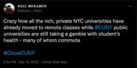 Tweet: #CloseCUNY Activism & NYC Higher Education Posted on March 10, 2020, this tweet reflected on the pandemic response efforts of private NYC universities compared to public universities like the City University of New York (CUNY). For many community members, the difference between university responses was linked to class dynamics. CUNY supports a largely immigrant and working-class population, serving as the best option for higher education to many of New York City's marginalized communities. Compared to the student populations at neighboring NYU and Columbia University, there is a stark class difference. To many members of the CUNY community, such class differences contributed to the marked apathy for the health of CUNY students. This item is part of the City University of New York (CUNY) Distance Learning Archive, a group project developed as part of Prof. Matthew K. Gold's Spring 2020 Knowledge Infrastructures seminar in the Ph.D. Program in English at The Graduate Center, CUNY, in partnership with the Interactive Technology and Pedagogy Certificate Program. The project's goal was to resist or trouble the discourse of catastrophe around the shift to online learning caused by the COVID-19 pandemic by documenting the lived experiences of students, faculty, and staff across CUNY's 25 campuses. Further, the project wanted to document the moment of crisis response by taking a critical approach to educational technology. -