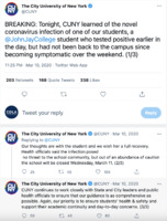 Tweet: CUNY Announcement of COVID-19 Infection at John Jay College Posted on March 10, 2020, this tweet represented the official announcement from the City University of New York (CUNY) administration regarding the exposure of John Jay's student body to COVID-19. While many other tweets in this collection show public awareness of a student testing positive for Covid-19 prior to CUNY's announcement, it is worth noting the community's shock as its fears were officially confirmed. While this tweet attempts an official conciliatory tone, it cannot be read without the sense of weight it conjured for the larger CUNY community. This item is part of the City University of New York (CUNY) Distance Learning Archive, a group project developed as part of Prof. Matthew K. Gold's Spring 2020 Knowledge Infrastructures seminar in the Ph.D. Program in English at The Graduate Center, CUNY, in partnership with the Interactive Technology and Pedagogy Certificate Program. The project's goal was to resist or trouble the discourse of catastrophe around the shift to online learning caused by the COVID-19 pandemic by documenting the lived experiences of students, faculty, and staff across CUNY's 25 campuses. Further, the project wanted to document the moment of crisis response by taking a critical approach to educational technology. -