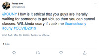 Tweet: Student Complaint This tweet questioned the ethical determination behind the City University of New York's (CUNY) continuance of in-person operations at the beginning of the pandemic. Like other artifacts in this section, this tweet expressed the broader CUNY community's perceptions of CUNY administration's reaction to the virus. Although some pointed out that concerns of equity drove CUNY's latency in closure (see "Tweet: Defense of CUNY by Student"), many saw such decisions as a question of gambling with the continued health of the community. This item is part of the City University of New York (CUNY) Distance Learning Archive, a group project developed as part of Prof. Matthew K. Gold's Spring 2020 Knowledge Infrastructures seminar in the Ph.D. Program in English at The Graduate Center, CUNY, in partnership with the Interactive Technology and Pedagogy Certificate Program. The project's goal was to resist or trouble the discourse of catastrophe around the shift to online learning caused by the COVID-19 pandemic by documenting the lived experiences of students, faculty, and staff across CUNY's 25 campuses. Further, the project wanted to document the moment of crisis response by taking a critical approach to educational technology. -