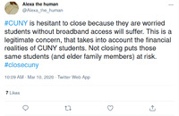 Tweet: Defense of CUNY by Student This tweet expressed a counter-narrative to the antagonism against City University of New York (CUNY) administration seen in other items in this collection, pointing out that the nature of CUNY's student body forced questions of equity to guide its decision to close the campuses while remaining open remotely. Though many artifacts in this collection underscore the expedited nature of the closing of private NYC institutions (see "Tweet: Student Complaint"), it is worth recalling that a large proportion of working-class and immigrant students who attend CUNY are reliant on its continued provision of a range of resources. Such artifacts demonstrated how the operation of CUNY is not simply a question of public health or economics but also of equity and accessibility. This item is part of the City University of New York (CUNY) Distance Learning Archive, a group project developed as part of Prof. Matthew K. Gold's Spring 2020 Knowledge Infrastructures seminar in the Ph.D. Program in English at The Graduate Center, CUNY, in partnership with the Interactive Technology and Pedagogy Certificate Program. The project's goal was to resist or trouble the discourse of catastrophe around the shift to online learning caused by the COVID-19 pandemic by documenting the lived experiences of students, faculty, and staff across CUNY's 25 campuses. Further, the project wanted to document the moment of crisis response by taking a critical approach to educational technology. -
