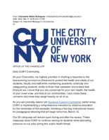 "An Important Message on Coronavirus" This email was from City University of New York (CUNY) Chancellor Félix V. Matos Rodriguez, was issued only a few hours after Gov. Cuomo's closure tweet. In this email, Chancellor Matos Rodriguez provided formal clarification regarding CUNY's transition to remote learning instigated by New York state, declaring an "instructional recess" of one week for CUNY faculty to transition their courses to online instruction. As well, the email listed resources and ongoing measures provided by CUNY administration. This item is part of the City University of New York (CUNY) Distance Learning Archive, a group project developed as part of Prof. Matthew K. Gold's Spring 2020 Knowledge Infrastructures seminar in the Ph.D. Program in English at The Graduate Center, CUNY, in partnership with the Interactive Technology and Pedagogy Certificate Program. The project's goal was to resist or trouble the discourse of catastrophe around the shift to online learning caused by the COVID-19 pandemic by documenting the lived experiences of students, faculty, and staff across CUNY's 25 campuses. Further, the project wanted to document the moment of crisis response by taking a critical approach to educational technology. -