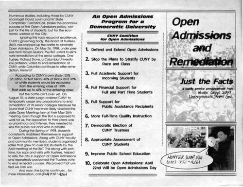 Open Admissions Fact Sheet This trifold pamphlet created by SLAM! debunks myths about remedial classes at CUNY's senior colleges and puts forward arguments for keeping CUNY's open admissions program. It educated students about the history and importance of open admissions at the time that the policy was being reversed by the Board of Trustees and SLAM! was fighting to preserve it. -
