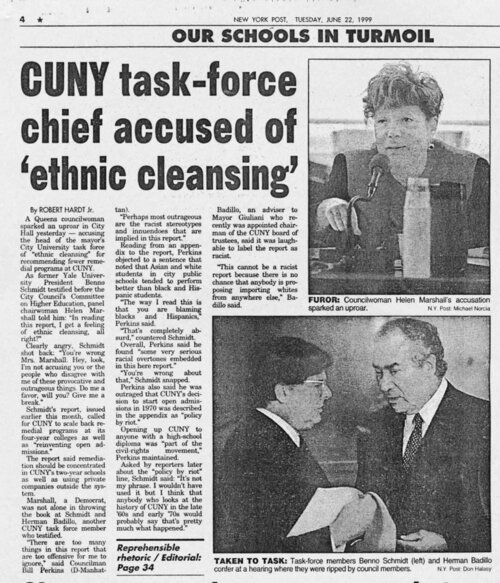 "CUNY Task Force Chief Accused of 'Ethnic Cleansing'" This New York Post article reports on a City Council Committee on Higher Education hearing at which council members remarked on the racism inherent in the effort of Mayor Giuliani's task force on CUNY to end open admissions. -