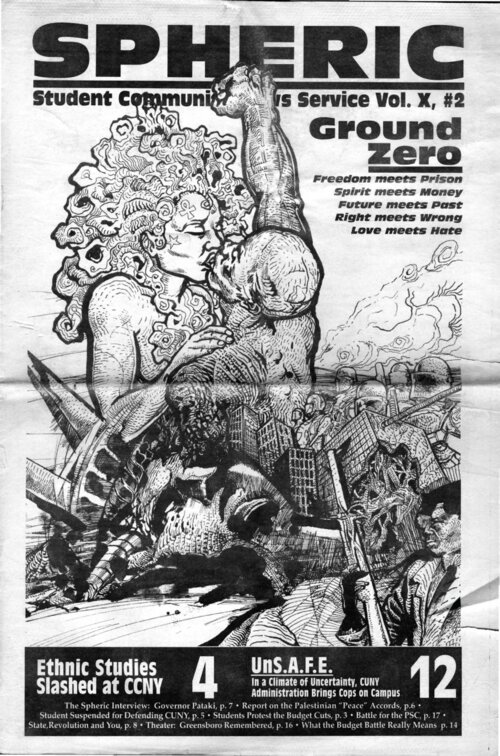 Spheric: Ground Zero This issue of Spheric, a Hunter College newspaper produced by activists from the CUNY Coalition, covers efforts organized by the Students Liberation Action Movement (SLAM!) to protest New York Governor George Pataki's plan to decrease state funding to CUNY. Additional articles cover such topics as: a CCNY student's lengthy suspension, the increased security presence on campuses, and a student's history of CUNY. -