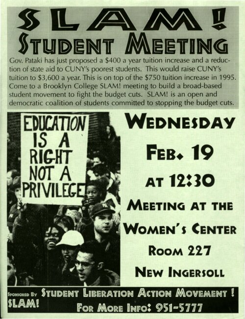 SLAM! Student Meeting Flier This flier was created by Brooklyn College SLAM! members to promote a meeting on campus to organize protests against a CUNY tuition hike in the spring semester of 1997. -