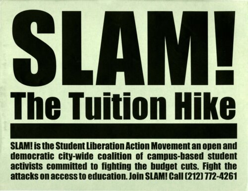 SLAM! the Tuition Hike Flier Students posted this flier in the hallways of their CUNY campuses across the city, as part of efforts to build and maintain SLAM! chapters at other campuses in addition to Hunter College. -