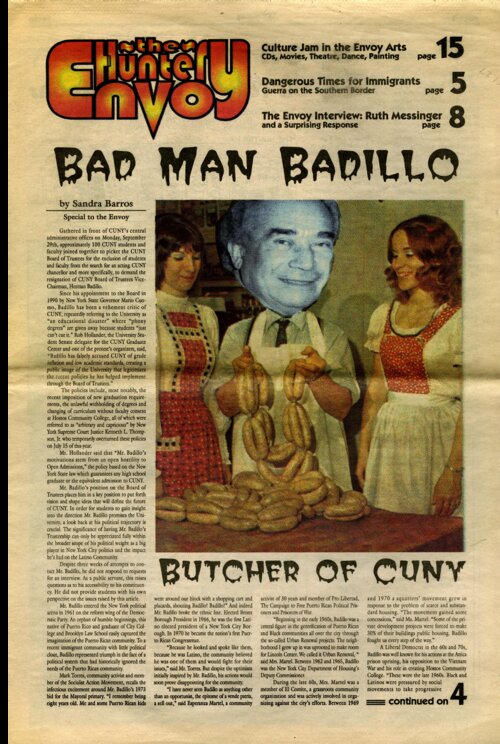 "Bad Man Badillo: Butcher of CUNY" This article by SLAM! member Sandra Barros for the Hunter Envoy investigates the role of CUNY Board of Trustees Vice Chair Herman Badillo in the plan to end open admissions at CUNY. This issue of the Envoy also includes an article about Hunter's childcare center, an interview with mayoral candidate Ruth Messinger, and an editorial about the mayoral election by SLAM! member Jed Brandt. -