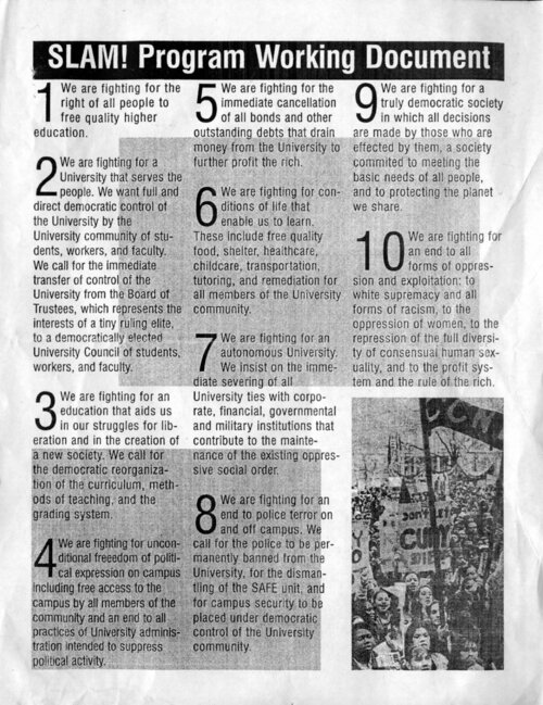 SLAM! Program Working Document SLAM!'s 10-Point Program outlines the organization's vision for transformation of the university and society, from access for all to free quality higher education to democratic governance by students, workers and faculty; education for liberation; campus security under democratic control; and a new society that would be truly democratic and meet the basic needs of all people. -