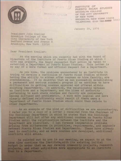 January 29, 1970 Request for Creation of a Department of Puerto Rican Studies at Brooklyn College This January 29, 1970, letter, written by Professor Josephine Nieves, Director of the Institute for Puerto Rican Studies at Brooklyn College (BC), makes an official request to found a Department of Puerto Rican Studies at the college. The letter describes challenges and obstacles that hinder the development of a Puerto Rican Studies curriculum within the college. The letter also reveals the distinct role institutes play in CUNY as compared to departments. This item is part of the Puerto Rican Studies at Brooklyn College (PRSBC) Collection, which covers the largely Puerto Rican-led student movement at Brooklyn College (CUNY) during the late 1960s and early 1970s that fought for the creation of the Puerto Rican Studies Department at the college. The collection includes oral history interviews with pioneering student activists, photographs of participants and their struggles, and other archival materials on the fight to create the Puerto Rican Studies Department drawn from the Archives and Special Collections library at Brooklyn College. -