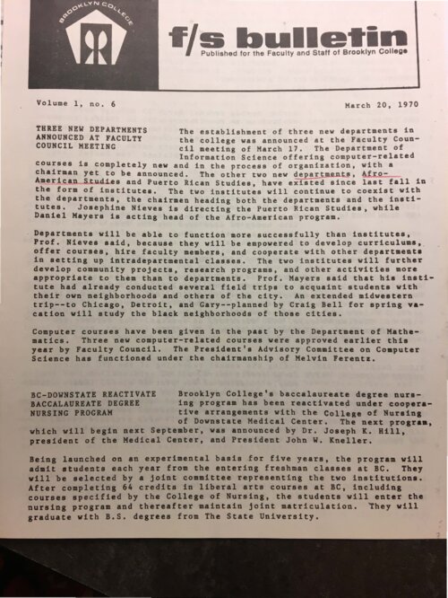 March 20, 1970 Brooklyn College Faculty-Staff Bulletin Announcing Creation of Three New Departments at the College Published by the Faculty and Staff of Brooklyn College (BC), this March 20, 1970 bulletin alerted the BC community of founding of three new departments approved at a BC Faculty Council meeting. The three departments--Information Science, Afro-American Studies, and Puerto Rican Studies--were approved at a March 17, 1970 Faculty Council meeting. Professors Josephine Nieves and Daniel Mayers were named as Directors of the Department of Puerto Rican Studies, and Afro-American Studies, respectively. The bulletin also described the visionary goals for both new departments. This item is part of the Puerto Rican Studies at Brooklyn College (PRSBC) Collection, which covers the largely Puerto Rican-led student movement at Brooklyn College (CUNY) during the late 1960s and early 1970s that fought for the creation of the Puerto Rican Studies Department at the college. The collection includes oral history interviews with pioneering student activists, photographs of participants and their struggles, and other archival materials on the fight to create the Puerto Rican Studies Department drawn from the Archives and Special Collections library at Brooklyn College. -