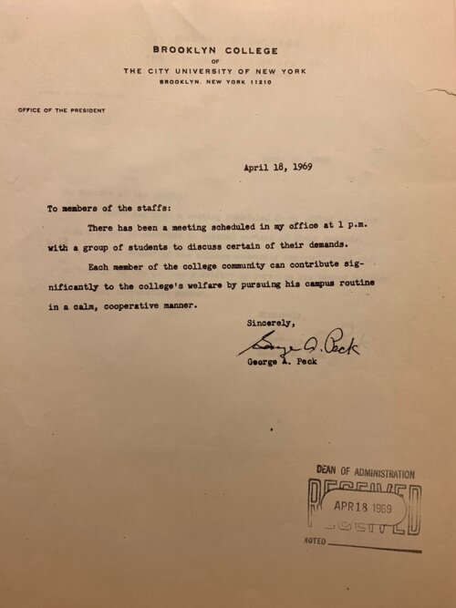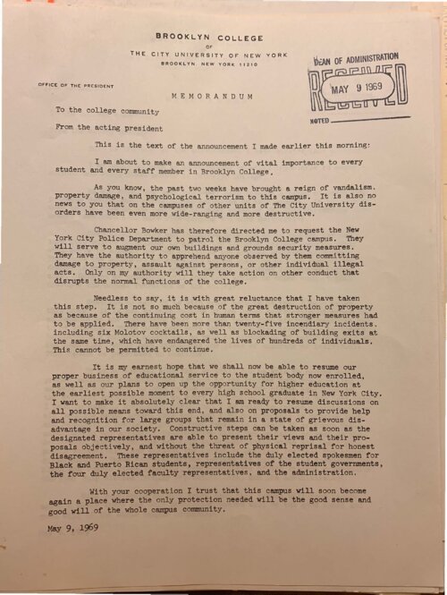 May 9, 1969 Announcement from Acting President George Peck alerting the Brooklyn College community that the NYPD would patrol the campus On May 9, 1969 Acting Brooklyn College (BC) President George Peck announced the role of the NY Police Department in response to the student-led movement at. The document described various protest strategies and acts of civil disobedience coordinated by members of the student body. The Acting President also commented on plans to implement CUNY's open admissions policy to provide college admission for every graduate of New York City high schools. This item is part of the Puerto Rican Studies at Brooklyn College (PRSBC) Collection, which covers the largely Puerto Rican-led student movement at Brooklyn College (CUNY) during the late 1960s and early 1970s that fought for the creation of the Puerto Rican Studies Department at the college. The collection includes oral history interviews with pioneering student activists, photographs of participants and their struggles, and other archival materials on the fight to create the Puerto Rican Studies Department drawn from the Archives and Special Collections library at Brooklyn College. -