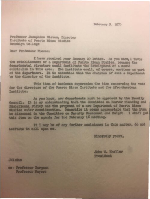 February 5, 1970 Letter from Brooklyn College President Kneller favoring the establishment of a Department of Puerto Rican Studies at the college In this February 5, 1970 letter from President John Kneller to Prof. Josephine Nieves, director of the Institute of Puerto Rican Studies at Brooklyn College (BC) responded to her formal request for the creation of a Department of Puerto Rican Studies at the college. President Kneller noted that the BC Faculty Council was considering the proposal to create the department and assured her the proposal would be included in the February 16 agenda of the Faculty Council Meeting. This item is part of the Puerto Rican Studies at Brooklyn College (PRSBC) Collection, which covers the largely Puerto Rican-led student movement at Brooklyn College (CUNY) during the late 1960s and early 1970s that fought for the creation of the Puerto Rican Studies Department at the college. The collection includes oral history interviews with pioneering student activists, photographs of participants and their struggles, and other archival materials on the fight to create the Puerto Rican Studies Department drawn from the Archives and Special Collections library at Brooklyn College. -