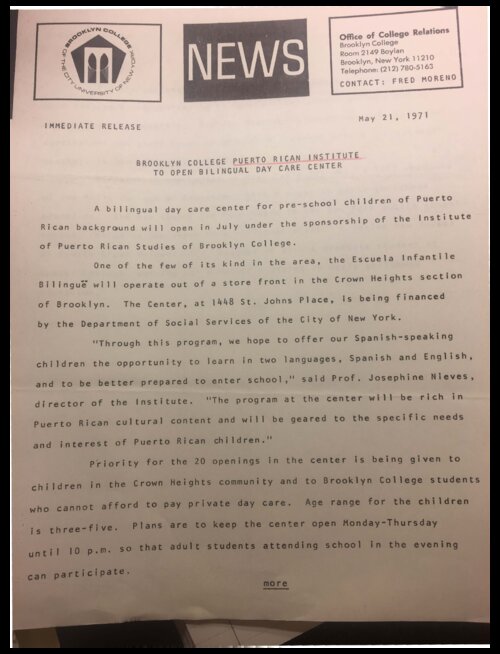 May 21, 1971 Press Release announcing opening of Bilingual Day Care Center by the Brooklyn College Institute of Puerto Rican Studies May 21, 1971 Press Release from Brooklyn College's (BC) Office of College Relations announced plans by the BC Institute of Puerto Rican Studies to open the first ever Bilingual Day Care Center in an effort to meet the needs of BC students and surrounding Brooklyn community. The Escuela Infantile Bilingüe was located in the Crown Heights section of Brooklyn and focused on Puerto Rican culture and history. This item is part of the Puerto Rican Studies at Brooklyn College (PRSBC) Collection, which covers the largely Puerto Rican-led student movement at Brooklyn College (CUNY) during the late 1960s and early 1970s that fought for the creation of the Puerto Rican Studies Department at the college. The collection includes oral history interviews with pioneering student activists, photographs of participants and their struggles, and other archival materials on the fight to create the Puerto Rican Studies Department drawn from the Archives and Special Collections library at Brooklyn College. -