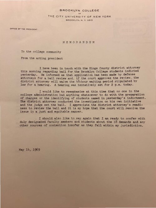 May 14, 1969 Letter from Brooklyn College Acting President George Peck Announcing a Bail Review for Indicted Brooklyn College Students A May 14, 1969 memo from Brooklyn College (BC) Acting President George Peck informed the college community about a bail review for BC students arrested during protests on the campus. The memo also stated Peck's commitment to confer with student leaders about the 18 demands presented by Puerto Rican and African-American students a month earlier. This item is part of the Puerto Rican Studies at Brooklyn College (PRSBC) Collection, which covers the largely Puerto Rican-led student movement at Brooklyn College (CUNY) during the late 1960s and early 1970s that fought for the creation of the Puerto Rican Studies Department at the college. The collection includes oral history interviews with pioneering student activists, photographs of participants and their struggles, and other archival materials on the fight to create the Puerto Rican Studies Department drawn from the Archives and Special Collections library at Brooklyn College. -