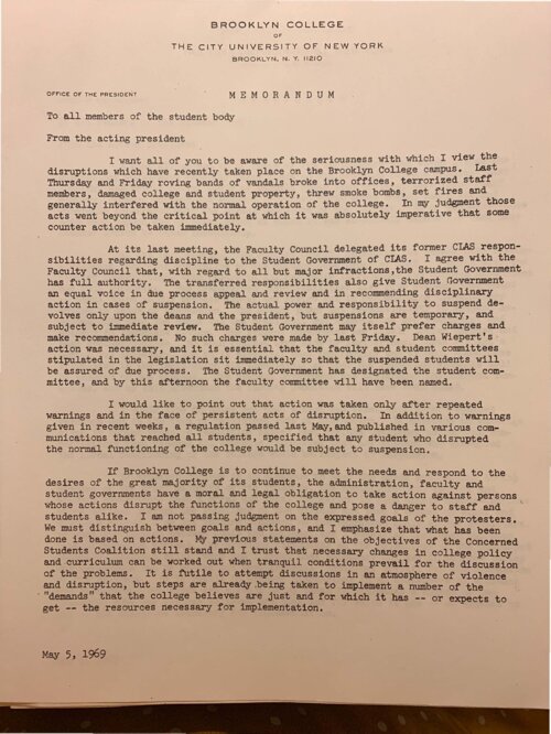 May 5, 1969 Memo from Brooklyn College Acting President George Peck discussing input from BC student government about student suspensions This May 5, 1969 memo from Brooklyn College (BC) Acting President George Peck alerted the BC campus about the role and responsibilities of the student government of College of Liberal Arts and Sciences (CLAS) regarding student suspensions. The memo noted the variety of protest and civil disobedience strategies engaged in by the current student-led movements at the college. The memo concluded with an assurance by the acting president that several of the students' 18 demands were already being met or were in the processes of being implemented. This item is part of the Puerto Rican Studies at Brooklyn College (PRSBC) Collection, which covers the largely Puerto Rican-led student movement at Brooklyn College (CUNY) during the late 1960s and early 1970s that fought for the creation of the Puerto Rican Studies Department at the college. The collection includes oral history interviews with pioneering student activists, photographs of participants and their struggles, and other archival materials on the fight to create the Puerto Rican Studies Department drawn from the Archives and Special Collections library at Brooklyn College. -
