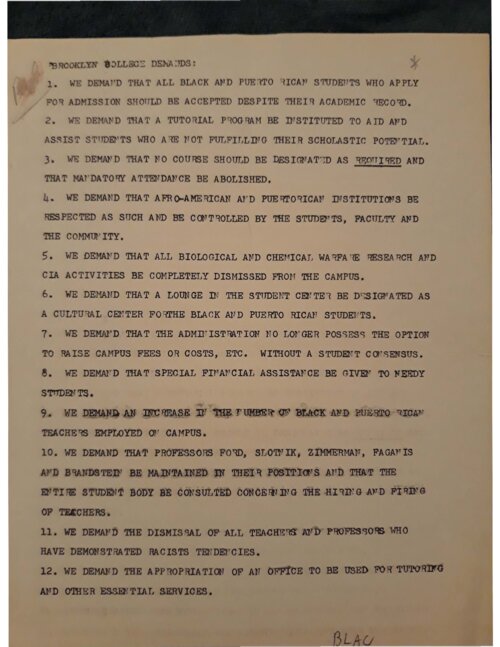 18 Student Demands presented in Spring 1969 to Brooklyn College Administration Puerto Rican and African American students at Brooklyn College (CUNY) co-wrote a list of 18 demands presented to the President of the college in the Spring of 1969. The Puerto Rican Alliance (P.R.A.) at Brooklyn College and the Brooklyn League of Afro-American Collegians (B.L.A.C.) were two student organizations central to the cultural, racial and educational transformation of the Brooklyn College student and faculty bodies, as well as college's curriculum. This list suggests the visionary-utopian goals of a CUNY-wide student movement, including the demand for the immediate implementation of an Open Admissions policy. This item is part of the Puerto Rican Studies at Brooklyn College (PRSBC) Collection, which covers the largely Puerto Rican-led student movement at Brooklyn College during the late 1960s and early 1970s that fought for the creation of the Puerto Rican Studies Department at the college. The collection includes oral history interviews with pioneering student activists, photographs of participants and their struggles, and other archival materials on the fight to create the Puerto Rican Studies Department drawn from the Archives and Special Collections library at Brooklyn College.