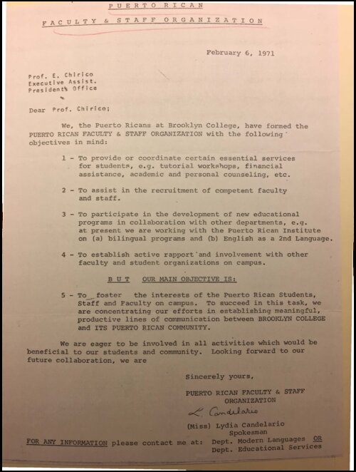 February 6, 1971 Letter from the Puerto Rican Faculty and Staff Organization to the Brooklyn College President Office Announcing the formation of the New Organization A February 6, 1971 letter from the newly formed Puerto Rican Faculty & Staff Organization to the Brooklyn College (BC) president, details the organization's objectives to racially and culturally transform the BC campus. The letter specifically noted that on the organization's main objective was to sustain communication between the BC administration and the campus's Puerto Rican community. This item is part of the Puerto Rican Studies at Brooklyn College (PRSBC) Collection, which covers the largely Puerto Rican-led student movement at Brooklyn College (CUNY) during the late 1960s and early 1970s that fought for the creation of the Puerto Rican Studies Department at the college. The collection includes oral history interviews with pioneering student activists, photographs of participants and their struggles, and other archival materials on the fight to create the Puerto Rican Studies Department drawn from the Archives and Special Collections library at Brooklyn College. -