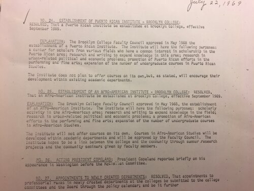 Summer 1969 Brooklyn College Faculty Council Resolution Confirming the Establishment of the Puerto Rican and Afro-American Institutes at Brooklyn College The establishment of both the Puerto Rican and Afro-American Institutes within Brooklyn College (BC), effective September, 1969, was announced in Minutes of the BC Faculty Council, . This document confirms the institutional purpose for both institutes as defined by the BC Faculty Council. The context also revealed that BC did not have plans to develop full departments of Puerto Rican or Afro-Americans Studies in 1969, noting that the institutes would offer courses through already existing academic departments within the college. This item is part of the Puerto Rican Studies at Brooklyn College (PRSBC) Collection, which covers the largely Puerto Rican-led student movement at Brooklyn College (CUNY) during the late 1960s and early 1970s that fought for the creation of the Puerto Rican Studies Department at the college. The collection includes oral history interviews with pioneering student activists, photographs of participants and their struggles, and other archival materials on the fight to create the Puerto Rican Studies Department drawn from the Archives and Special Collections library at Brooklyn College. -