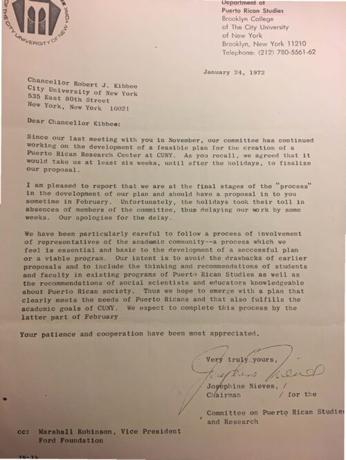 January 24, 1972 Letter from the Committee on Puerto Rican Studies and Research to CUNY Chancellor Kibbee confirming a plan to create a Puerto Rican Research Center at CUNY This January 24, 1974 letter to CUNY Chancellor Robert Kibbee, co-signed by Brooklyn College Department of Puerto Rican Studies Chairperson Josephine Nieves, confirmed a proposal to create a Puerto Rican Research Center at CUNY. The proposed research center eventually became the Center for Puerto Rican Studies at Hunter College, CUNY. This item is part of the Puerto Rican Studies at Brooklyn College (PRSBC) Collection, which covers the largely Puerto Rican-led student movement at Brooklyn College (CUNY) during the late 1960s and early 1970s that fought for the creation of the Puerto Rican Studies Department at the college. The collection includes oral history interviews with pioneering student activists, photographs of participants and their struggles, and other archival materials on the fight to create the Puerto Rican Studies Department drawn from the Archives and Special Collections library at Brooklyn College. -