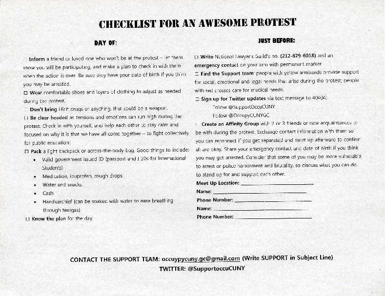 Occupy CUNY created this checklist for an “awesome protest.” Tips included writing the National Lawyer’s Guild number on your arm, twitter update information and advice for affinity groups. Contact information for the Occupy CUNY support team was also provided.
