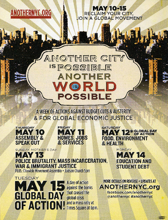 This flyer announces a week of actions in NYC against budget cuts, austerity and global economic justice. May 14th concentrated on education and students with leafleting and picketing for quality public schools, free education and against student debt .