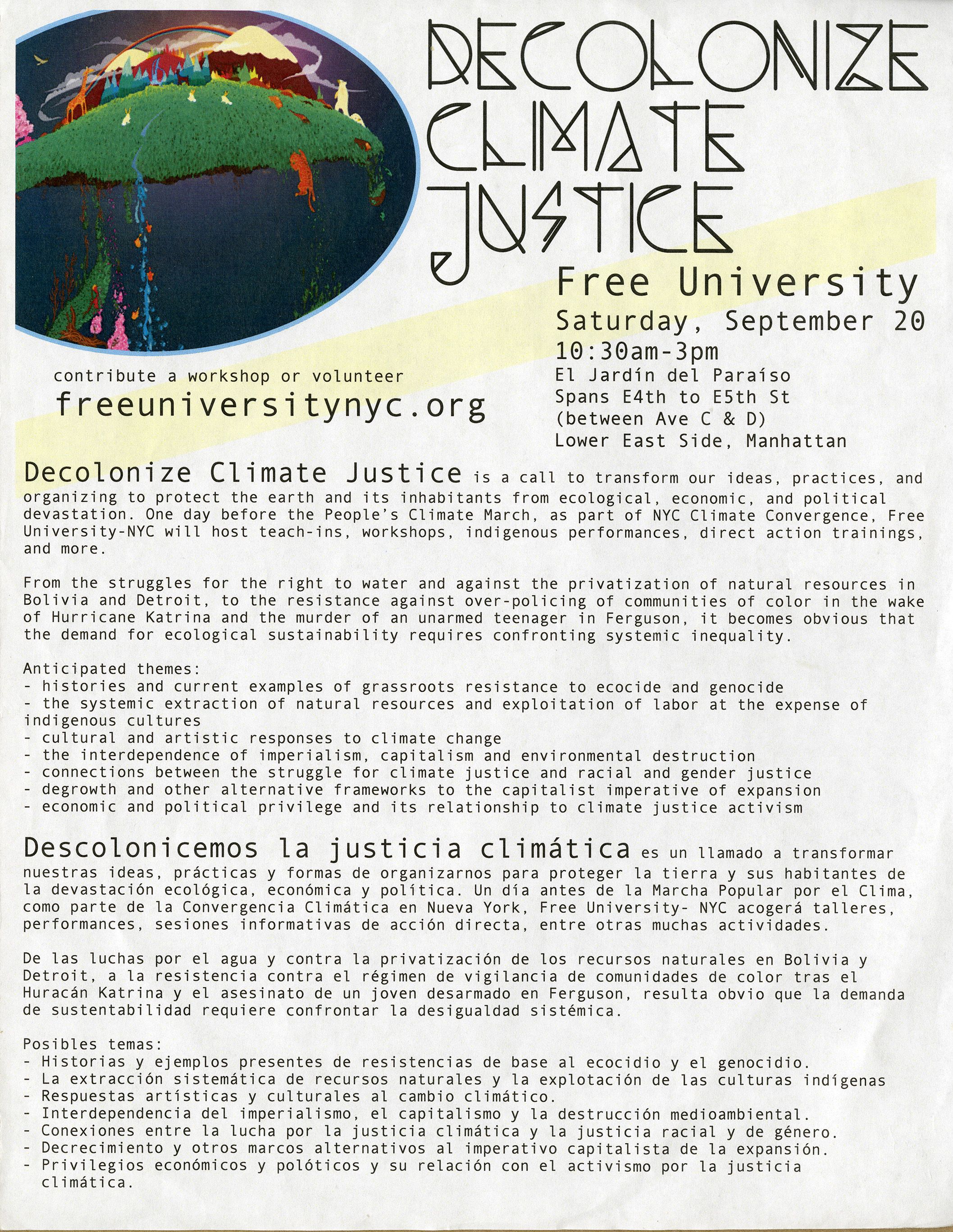 The Decolonize Climate Justice bilingual flyer is a call for workshops and volunteers. Held one day before the historic climate march in NYC, the Free University offered workshops, teach-ins, direct action trainings and indigenous performances positioned at the nexus of environmental justice and systemic inequality.
