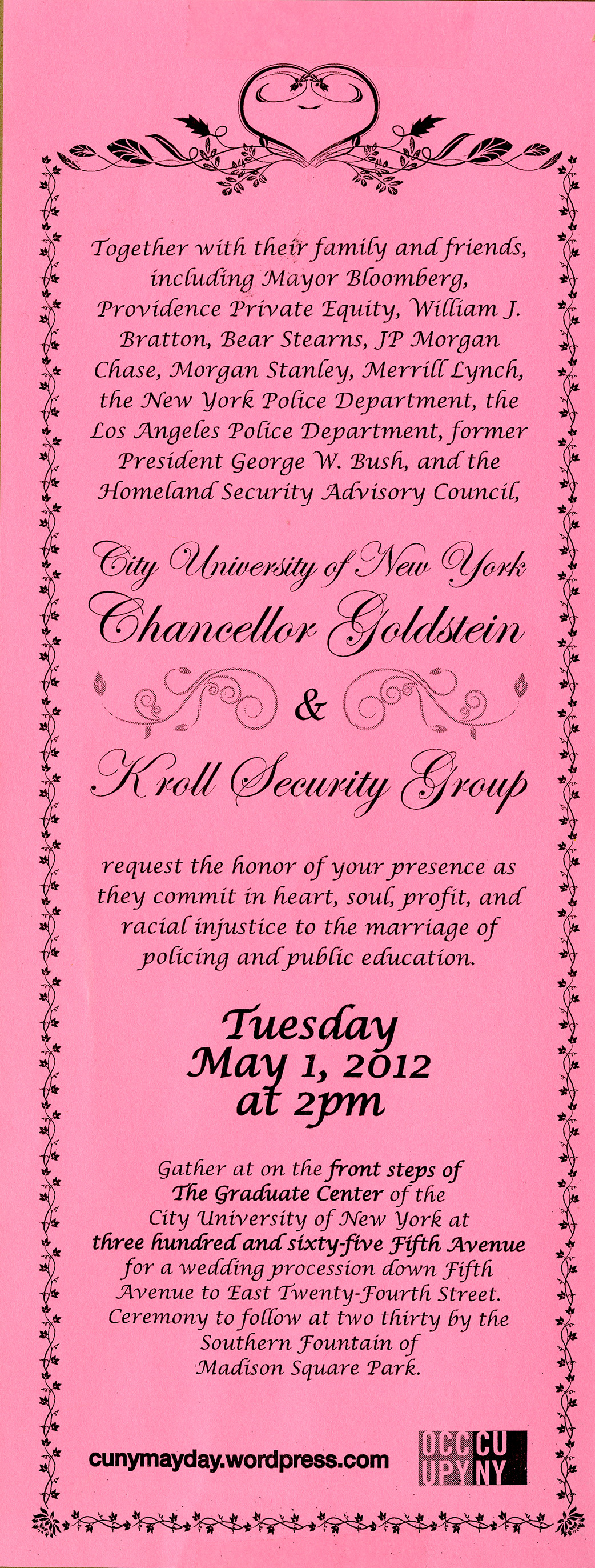 This invitation to a mock wedding between Chancellor Goldstein and Kroll Security Group announces the protest in the form of a satirical wedding procession and ceremony, which was held on May 1, 2012.