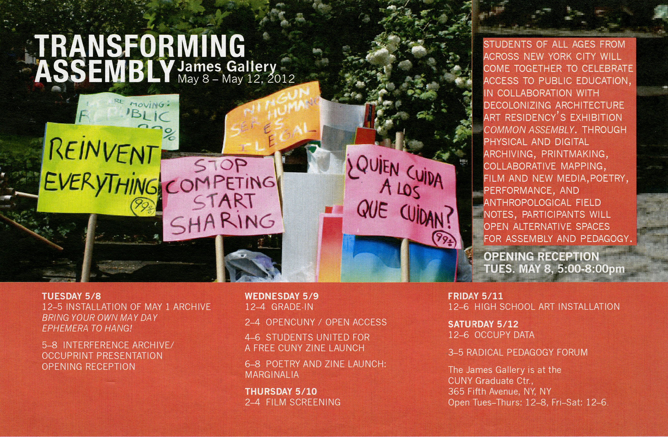 In collaboration with the Decolonizing Architecture Art Residency’s exhibition Common Assembly, these workshops were positioned at the intersection of pedagogy, art and activism. Workshops, zine launches and various groups including the Interference Archive, Occuprint, Open CUNY/Open Access, and Occupy Data facilitated forums.