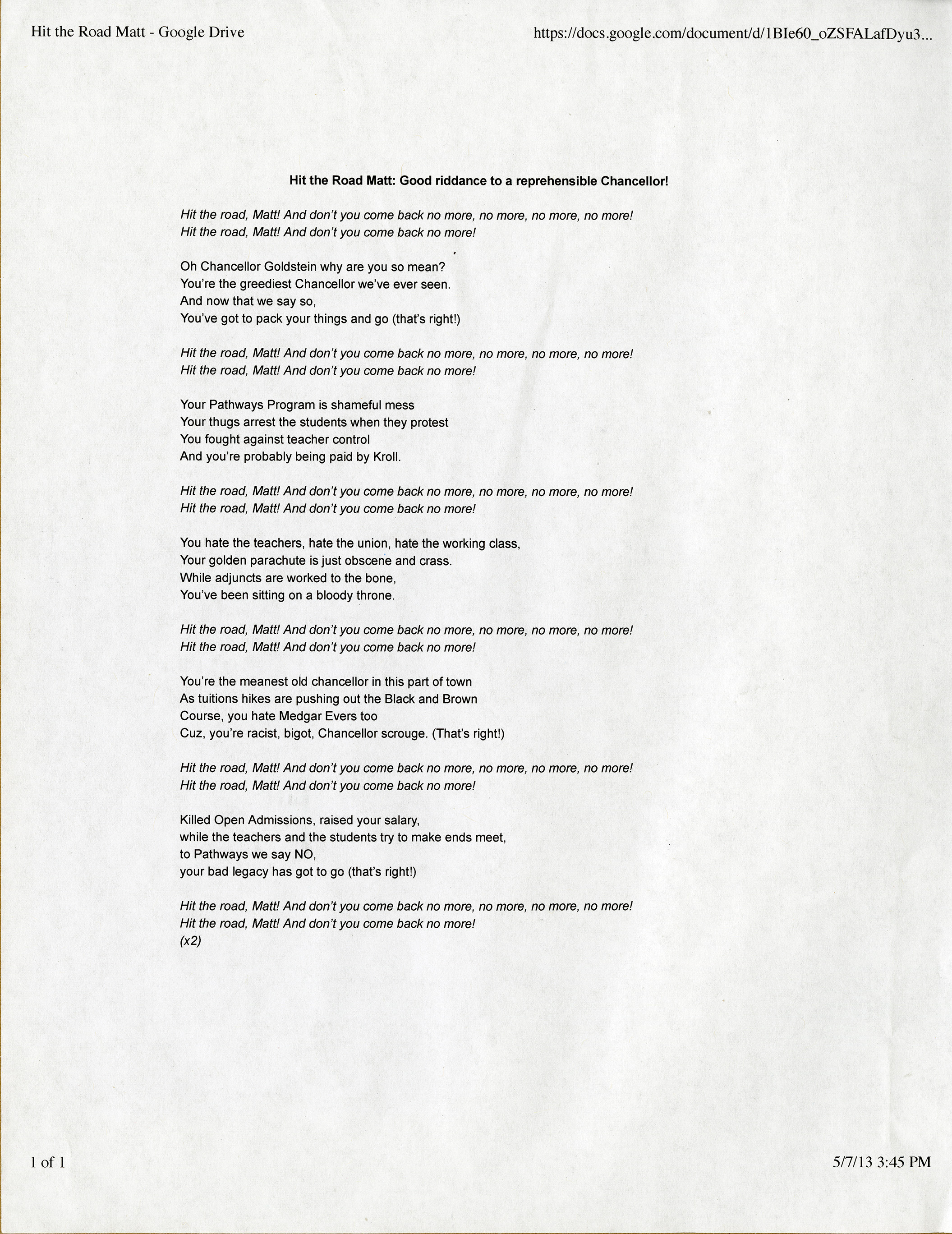 Occupy CUNY. Letter. “Song: ‘Hit the Road Matt: Good Riddance to a Reprehensible Chancellor!’.”, CUNY DIGITAL HISTORY ARCHIVE, accessed March 10, 2026, https://stephenz.tailc22a4b.ts.net/s/cdha/item/1076
