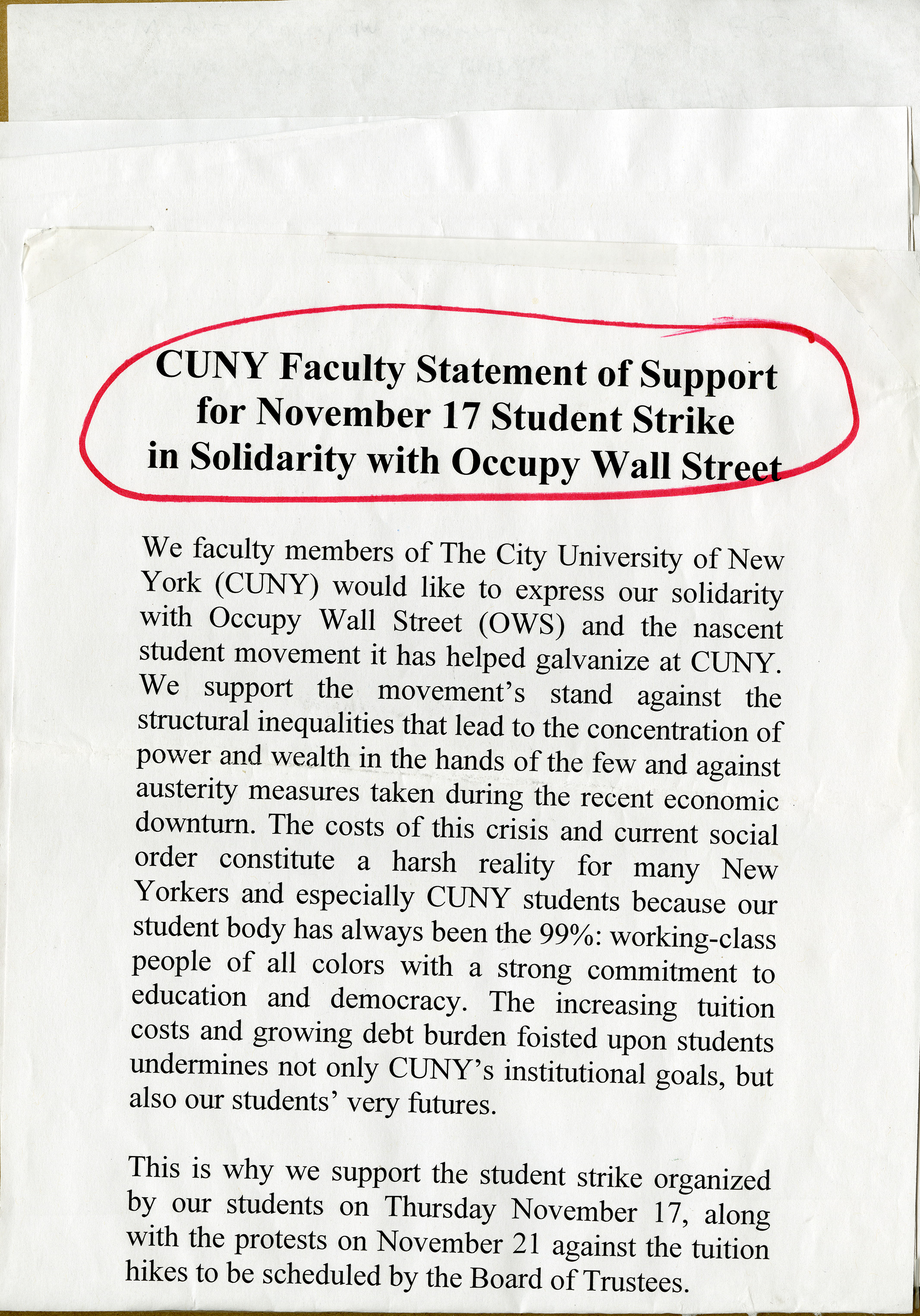 CUNY Faculty Statement of Support, written primarily by Graduate Center faculty, for the November 17, 2011, Student Strike, in solidarity with Occupy Wall Street.