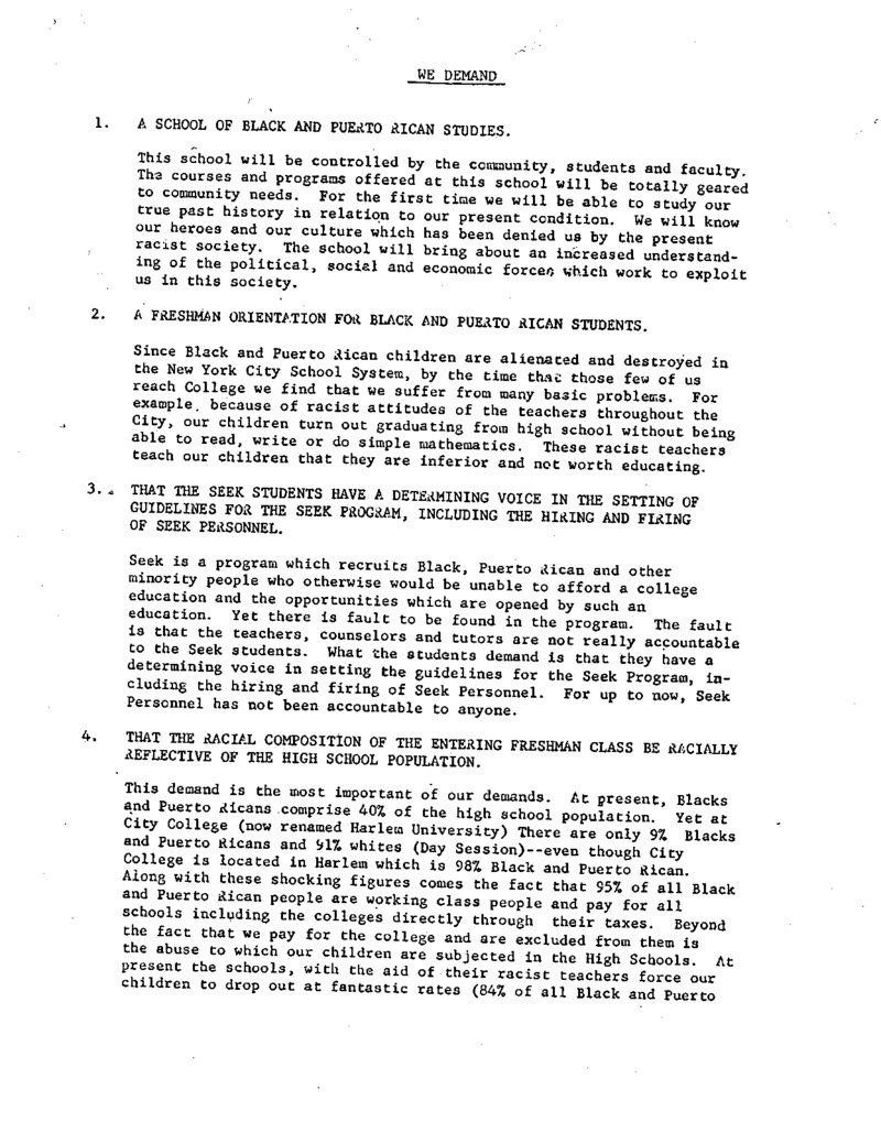 This handout, created by a group of protesting City College students, offers insight into the motivations behind a campus-wide strike in April/May 1969. Black and Puerto Rican students, as well as white supporters, demanded the college meet these five demands that sought to reorient the college towards the largely overlooked black and Puerto Rican communities in the college's Harlem neighborhood.