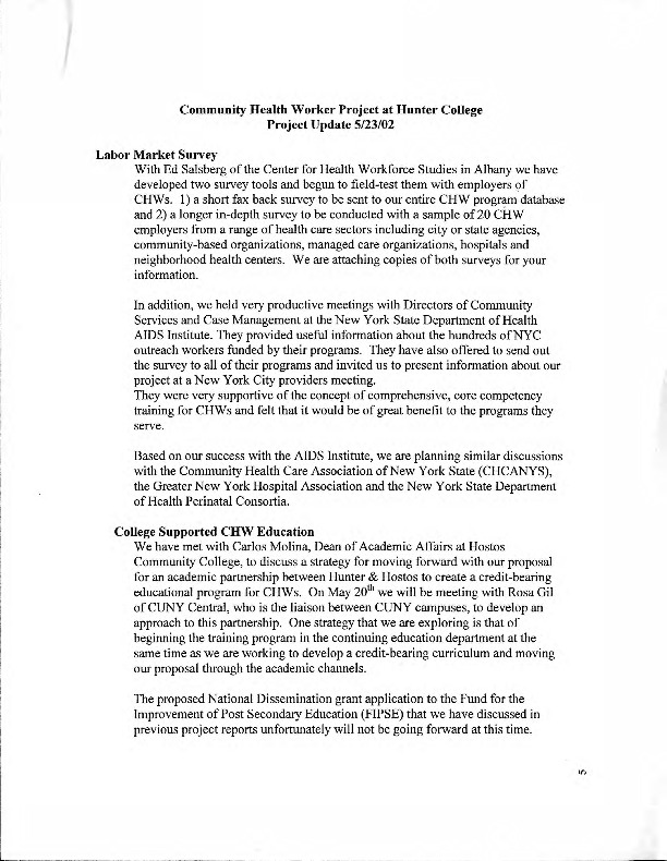 Community Worker Project (CWP). Letter. “Community Health Worker Project at Hunter College - Project Update 5 23 02.”, CUNY DIGITAL HISTORY ARCHIVE, accessed March 10, 2026, https://stephenz.tailc22a4b.ts.net/s/cdha/item/1176