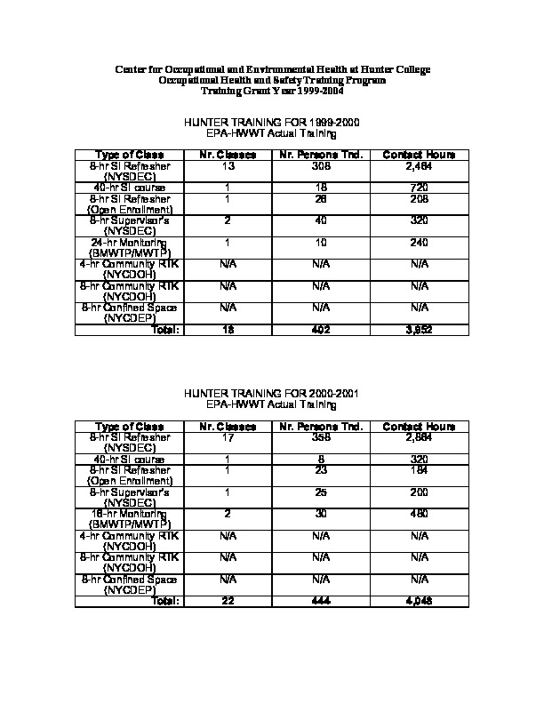 The Center for Occupational and Environmental Health compiled these tables breaking down the programs for Hazardous Waste Workers Training (HWWT) offered from the years 1999-2004 by type of class, number of classes, number of people trained and contact hours. In addition to "open enrollment" courses, the Center tailored specific courses for New York State's Departments of Health, the Environmental Conservation, New York City's Department of Environmental Protection, and Minority Worker Training Programs. Between 1999 and 2004, the Center offered 106 classes, training 2,182 people in total.