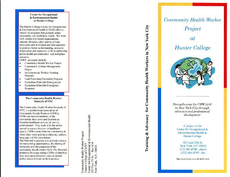 This brochure advertises the "Community Health Worker Project" run by Hunter College's Center for Environmental and Occupational Health (COEH). The project, one of COEH's major initiatives, recruited local residents from New York City neighborhoods for an extensive 350-hour curriculum that educated participants on the topic of asthma, its management, assessment, and remediation. Following their training, these health workers were entrusted with providing outreach to their communities, serving as a "vital link between health care providers, community organizations, and the communities they serve." In April 2000, the program commenced with an initial class of 15 health workers from a variety of community groups.